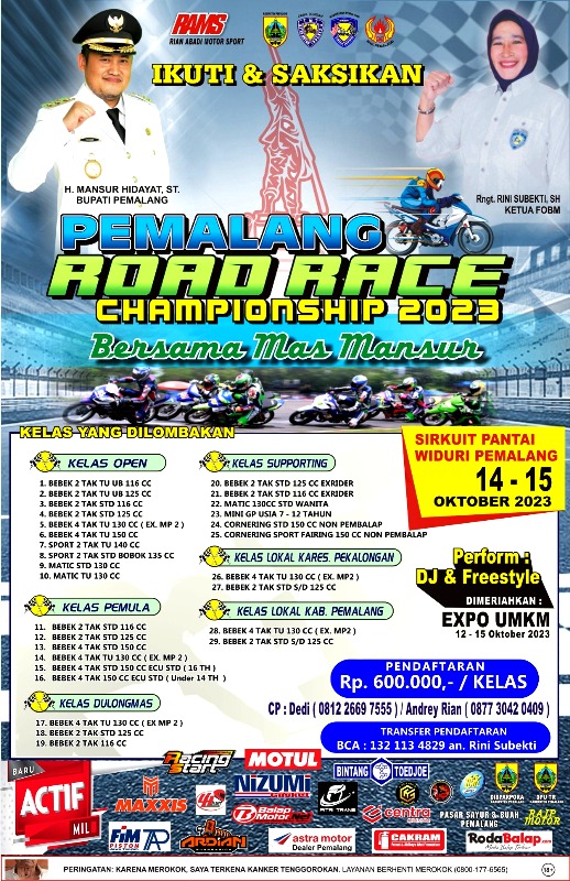 Enginesport.co – Tinggal hitungan hari Road Race Pemalang Championship 2023 bakal tayang di sirkuit permanen Pantai Widuri (14-15/10). Catat tanggal mainnya ya jangan sampai ketinggalan, prepare, daftar dan pilih kelasnya. Terakhir kali ada balap di sirkuit Pantai Widuri 8 tahun lalu tepatnya tahun 2015. Promotor Road Race Pemalang Championship 2023 siapa lagi kalau bukan Rini Subekti SH owner Rams Organizer sekaligus Ketua FOBM Pemalang.