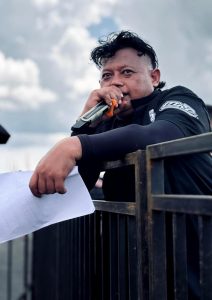 Pria yang acap berdandan ala Naruto ini tak hanya diam di satu titik saat melakukan tugasnya. Tiba tiba doi sudah berbaur ke penoton atau duduk nyantai di atas kotak ampli sound. Memasuki area start memberi semangat pembalap. Say hello ke media, owner tim, crew dll. Kadang komen sambil ngatur urutan lagu rock dan metal di area sound system. Pastinya semua itu dilakukan tanpa mengurangi eksistensinya sebagai MC.