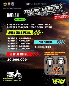 Enginesport.co – Tinggal hitungan hari, event road race berlabel Tolak Miskin Championsip 2025 round 2 akan begulir di sirkuit Boyolali (27-28/12). Balap ini di promotori oleh Yudis selaku owner YR2stroke, seri perdana sudah tayang pertengahan tahun. Waktu itu konsepnya balap latber yang staternya khusus pembalap pemula.